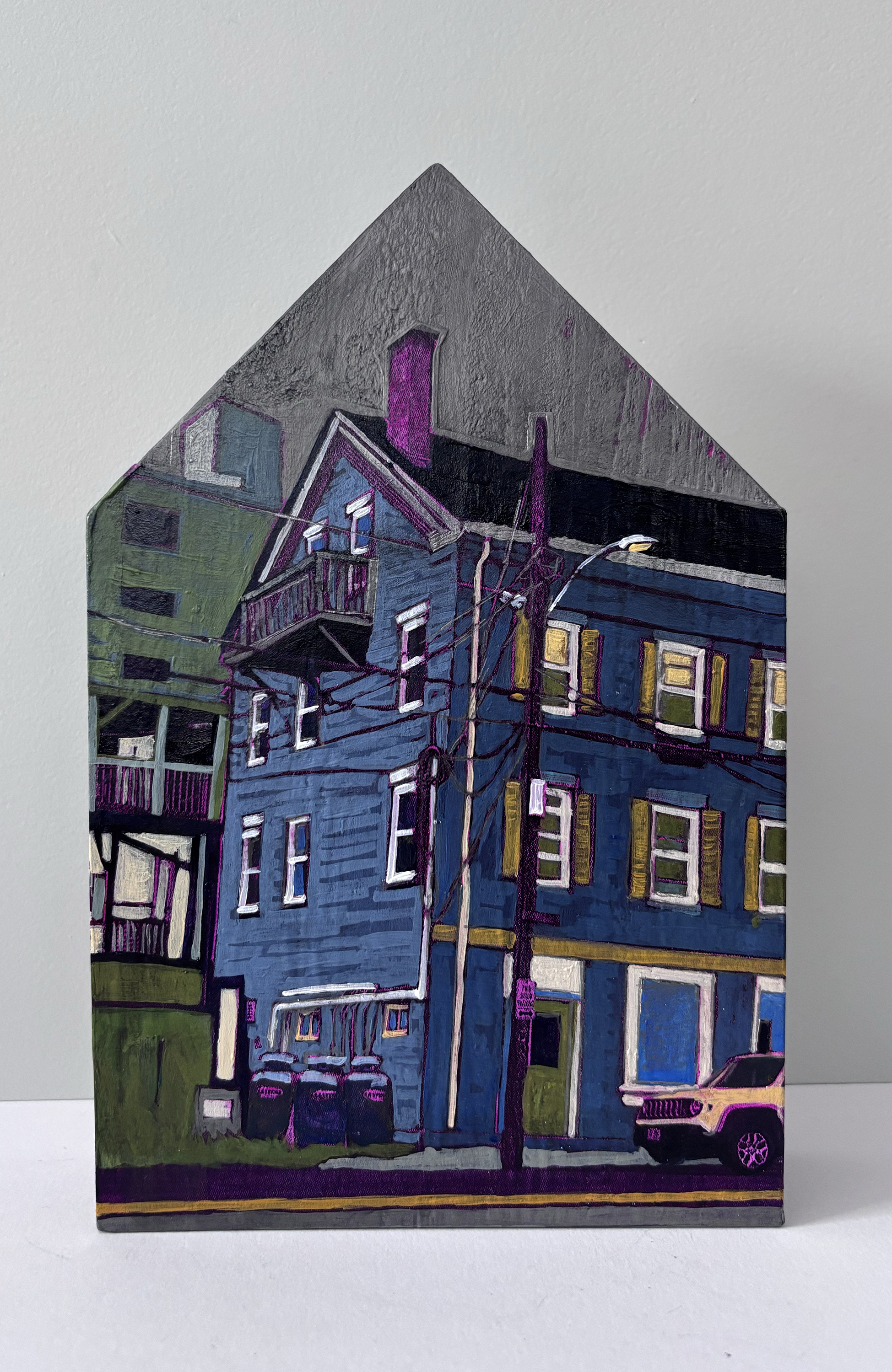 This piece is collage and acrylic on a custom wood panel. In my work, I collage photographs I have taken to wood panels and paint directly onto these collages. The buildings in this piece are on the street facing the Mills at Salmon Falls in Rollinsford NH. The mills sit on the banks of the Salmon Falls river and house a number of artist studios and businesses.