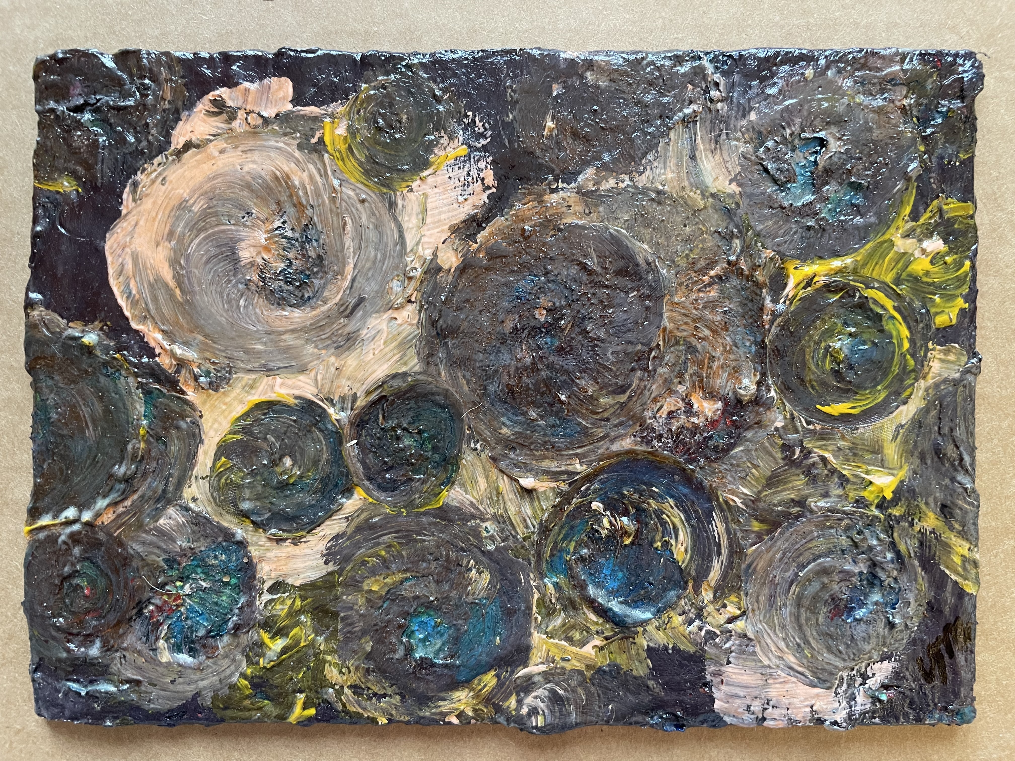 Acrylic paint on canvas panel. 7" x 5". Layers of energy churning individually, yet creating a masterpiece of a garden together. We are all little microcosms working together, complimenting each other's truth, to create something whole.