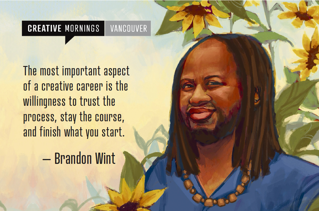 The text is from our interview with Brandon, and reads: “The most important aspect of a creative career is the willingness to trust the process, stay the course, and finish what you start.”