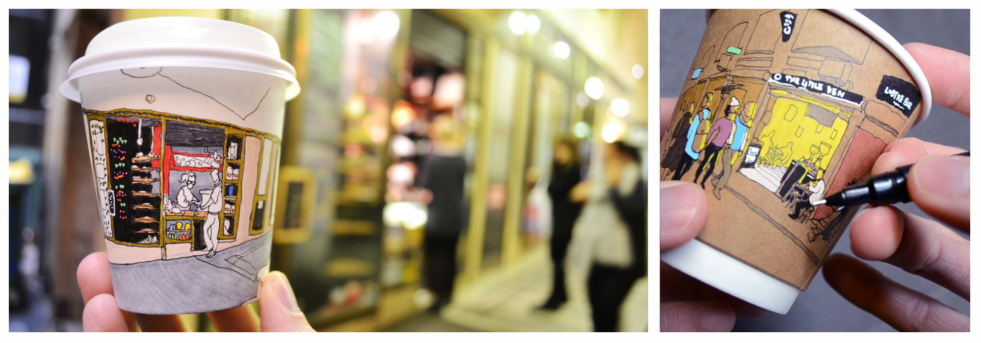 I drew over 80 cafes on their very own takeaway coffee cups while living in Melbourne, Australia. It was fun, relaxing and, it was by far my favorite thing to do for 4 years. Out of that experience, I self-published a book that I launched during a coffee cup art exhibition in Fitzroy, Melbourne. The book got sold in libraries and online.